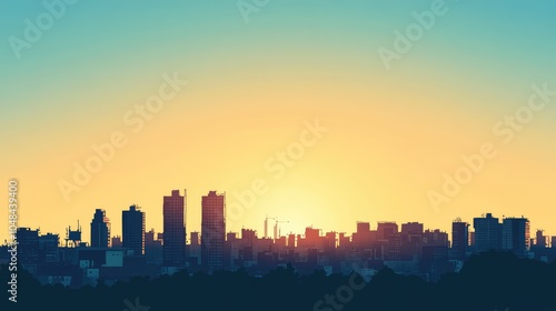 A bright morning sky with the silhouette of a city's skyline basking in the early light, the tall buildings rising against the clear horizon