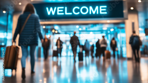 A bright "Welcome" sign in a sleek, modern airport terminal, with blurred travelers pulling suitcases in the background.