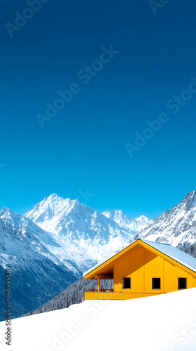 mountain, snow, house, yellow, blue, serene, escape, calmness, solitude, peaceful, retreat, explore, contrast, pristine, remote, elevation, light, idylli, horizon, picturesque, cabin, sky, holiday, peak, vacation, scenery, scenic, beauty, nature, bright, destination, environment, rural, season, travel, fresh, cold, architecture, adventure, landscape, winter, view