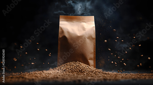 A brown coffee bag mockup on a black background with scattered raw
