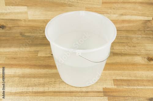 A bucket with water on wooden background