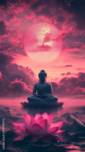 A Buddha statue with a brilliant sun and gorgeous mountains in the background, perched atop a big lotus blossom.
