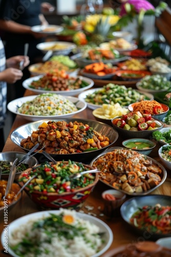 buffet, table, food, delicious, healthy, vegetable, fruit, grain, protein, feast, catering, eatery, meal, lunch, dinner, party, celebration, holiday, event, gathering, people, community, culture, cookery, tradition, favor, taste, nourishment, nourishment, sustenance, hunger, appetence, desire, indulgence, satisfaction, happiness, joy, colourful, dining, diverse, festival, finger food, food court, epicure, fork