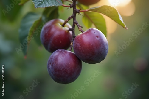 A Bunch of Plums Hanging From a Tree Branch in the Sun - Generative AI