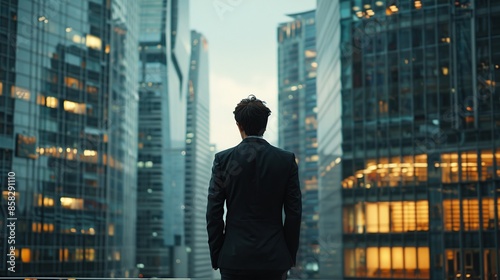 A business man stands in front of skyscrapers, looking at the city with confidence and determination.