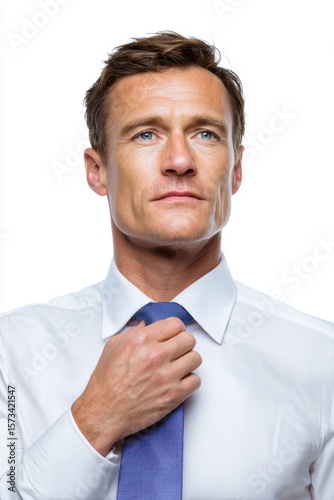 A business professional male adjusting his tie, isolated on a white background. Professionalism, preparation.