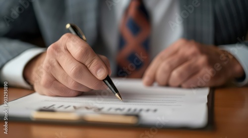 A business professional signs a document, showcasing attention to detail and commitment in a corporate environment.