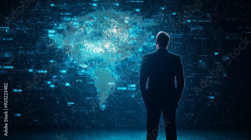 A businessman gazes at a digital world map, representing technology, innovation, and global connectivity in cyberspace.