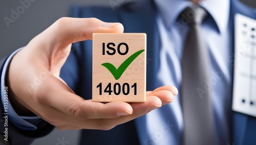 A businessman holding a small wooden block with a green checkmark and 'ISO 14001' written on it. ISO 14001 certified, iso 14001 environmental management system