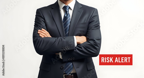 A businessman in a dark suit and tie stands with his arms crossed against a white background. A red banner in the corner reads, "RISK ALERT".