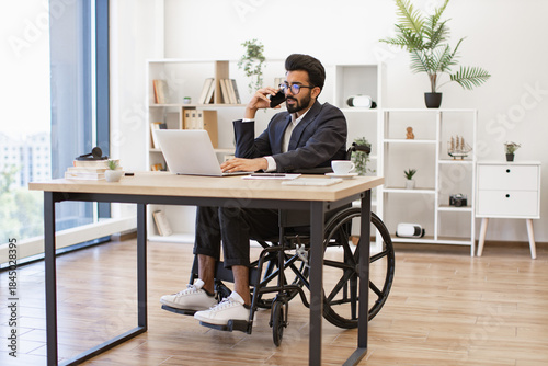 businessman, wheelchair, office, working, disability, accessibility, laptop, phone, call, desk, suit, goggles, male, man, arab, muslim, arabian, guy, business, professional, communication, technology, modern, interior, contemporary, success, confident, serious, focused, adult, person, indoor, lifestyle, workspace, furniture, white, black, formal, smart, casual attire, startup, entrepreneur, freelancer, remote, online, project, meeting, adviser, indian