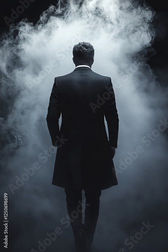 A businessman in the fog, the silhouette of an elegant man walking towards us. He is wearing a dark suit and tie, seen from behind. Soft light from above, haze around him, a foggy background,