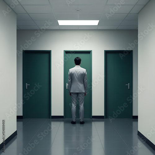 choice, door, solution, businessman, career, person, office, corridor, path, alternative, opportunity, dilemma, future, same, three, racked, thinks, problem, concept, metaphor, impasse, stagnation, uncertainty, doubt, task, direction, entry, suspense, loneliness, suit, employee, manager, search, strategy, illusion, business, corporate, minimalism, confusion, intersection, option, equal, chance, question, challenge