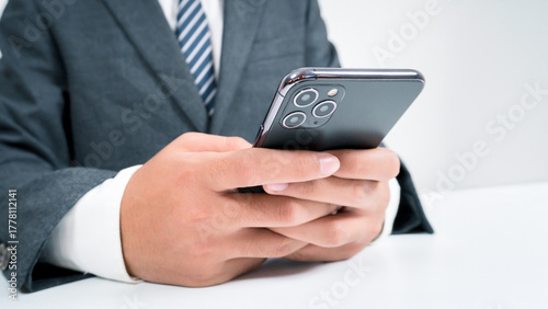 A businessman is using a smartphone to conduct financial transactions via online banking and other transactions via the internet and big data via his smartphone.