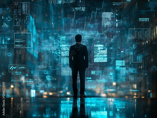 analysis, business, technology, screen, datum, digital, information, financial, future, monitoring, network, display, interface, abstract, modern, decision, perspective, control, progress, success, strategy, visual, window, building, night, city, light, silhouette, dark, suit, man, standing, observing, futuristic, illuminated, bright, glow, pattern, chart, graph, coding, algorithm, virtual, detail, closeup, view