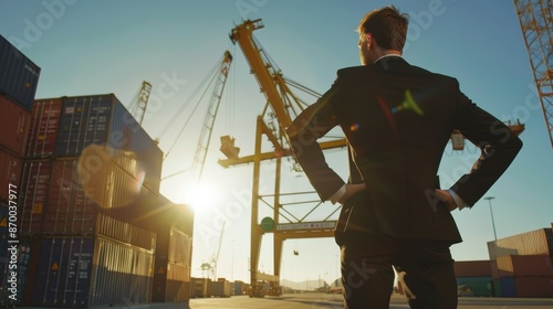 businessman, shipping, port, sunset, hand, hip, look, racked, container, logistic, marina, import, economy, distribution, operation, bazaar, export, maritime, transportation, harbor, supervision, vessel, oversee, waterway, cargo, vision, optimize, terminal, enterprise, inventory, warehouse, coordination, business, environment, skyline, businessperson