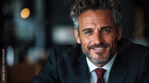 businessman, curly hair, beard, suit, confident, professional, success, smiling, smile, sunny, warmth, happy, portrait, mature, face, expression, human, contentment, cheerful, career, sophistication, elegant, modern, blur, background, depth, clarity, office, sharpened, work, sharp, realistic, present, aesthetic, pleasant, successful, accomplished, photogenic, upbeat, sophisticated, important