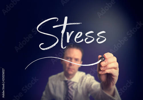 A businessman writing a Stress concept with a white pen on a clear screen.