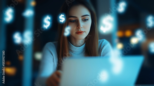 A businesswoman engrossed in financial work on her laptop, with dollar signs appearing in the air