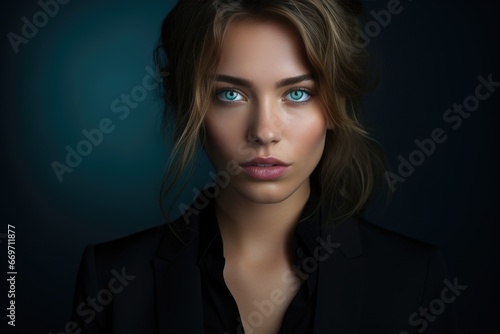 A businesswoman in a black shirt on a dark background smiles. Successful woman concept.