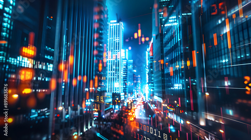 A bustling city street at night illuminated by vibrant lights and filled with the movement of traffic