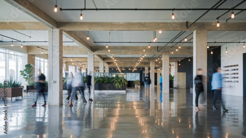 A bustling modern office space with blurred figures walking past, showcasing an open layout and contemporary design elements.