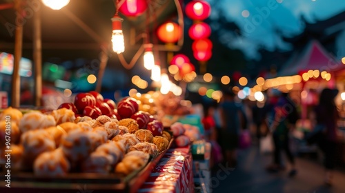 A bustling night market with brightly lit food stalls, showcasing a variety of delicious treats. The photo captures the vibrant atmosphere of a bustling street market.