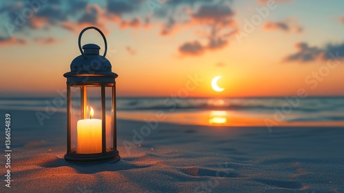 A candle lantern on a sandy beach at sunset, with a crescent moon in the sky. Perfect for Islamic holidays like Ramadan Kareem, Eid Al Adha, Eid Al Fitr, and Mubarak. Space for your message.