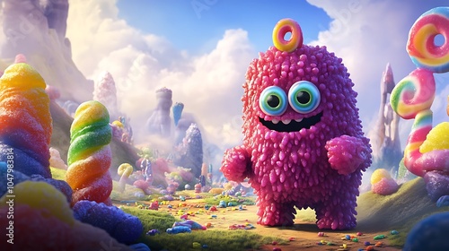monster, candy, sweet, colourful, happy, cheerful, cute, cartoon, whimsical, fantasy, illustration, digital artwork, three-dimensional, wonderland, sugar, treat, dessert, fun, playful, vibrant, bright, imaginative, joyful, childlike, dreamlike