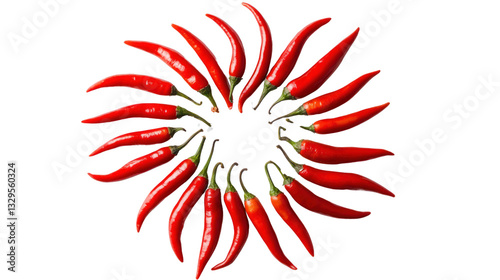 A captivating arrangement of red chili peppers forming a circular pattern, isolated on a white background.