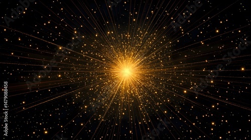 A captivating image of a radiant golden - hued explosion or burst, with lines and numerous small lights emanating from a central bright point against a dark background.