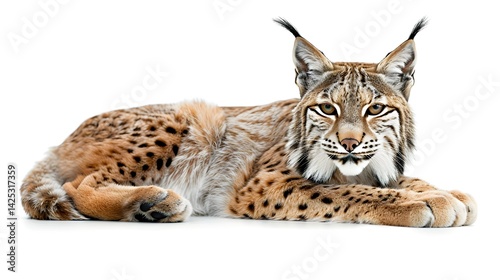 A captivating lynx with tufted ears and spotted fur rests against a bright white background, its gaze direct and intense. Wild and beautiful.