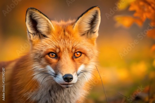 A captivating red fox gazing intently, bathed in the warm glow of autumn's golden light, with blurred foliage adding depth.