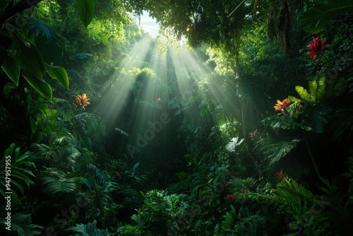A captivating scene of a dense forest with radiant sunbeams illuminating the vibrant foliage and creating an enchanting and tranquil atmosphere.