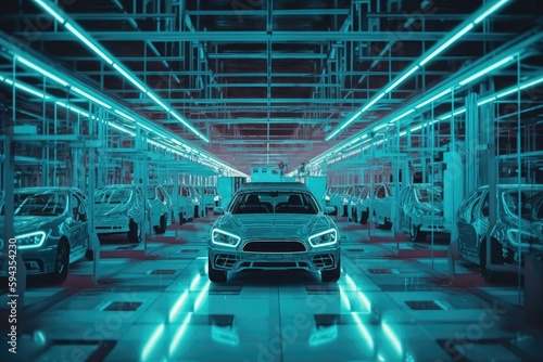 A car assembly factory in a wide hall . car industry. Ai generative