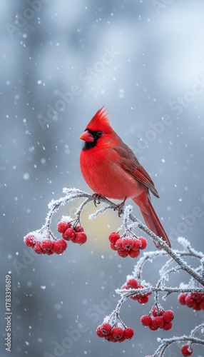 A cardinal bird sitting on a frosty branch with red berries, gentle snowflakes falling, cold morning atmosphere