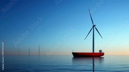 A cargo ship powered by wind turbines sailing through calm waters, with the sky and ocean providing vast space for copy, sustainable supply chain management