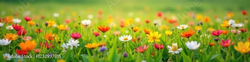 A carpet of colorful blooms stretches across the grassy landscape, meadow, wildflowers
