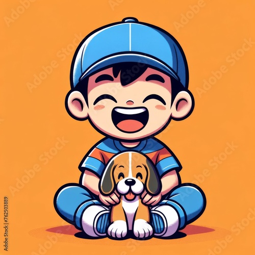 a cartoon boy, laughing, sitting cross-legged, wearing a blue baseball cap, holding a beagle puppy, full body