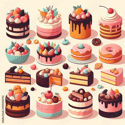 cartoon, cake, cake, colourful, illustration, playful, fun, vibrant, whimsical, celebration, assortment, cupcake, sprinkle, icing, cherry, tier, decoration, variety, favor, sweet, dessert, food, party, design, cheerful, exaggerated, bright, happy, creative, joyful, festive, charming, cute, bakery, sugar, frosting, character, pastry, indulgence, adorable, delicious, inviting, artistic, animated, lively