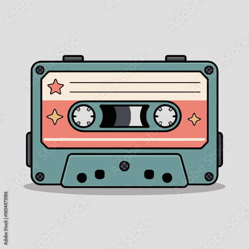 A cartoon illustration of a retro cassette tape with stars on a light gray background design style