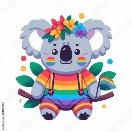 A cartoon koala wearing a rainbow outfit and holding a rainbow flag