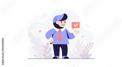 A cartoon man in a blue shirt, red tie, and blue cap with a checkmark