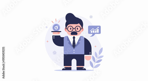 man, suit, attaching, vest, shirt, pant, shoe, goggles, hair, mouth, nose, ear, eye, hand, arm, coin, holding, tray, sparkle, glowing, speech, bubble, chart, graph, up, arrow, background, white, purple, blue, black, light, dark, illustration, cartoon, character, businessman, finance, success, growth, investment, concept, idea, money, profit, wealth, rich, valuable, precious