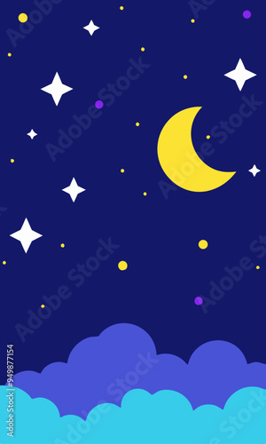 A cartoon of a night sky with a crescent moon and stars