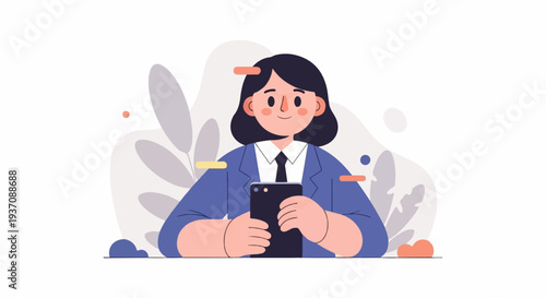 cartoon, person, suit, phone, minimalist, plant, background, illustration, digital, art, technology, communication, online, social, media, app, screen, holding, looking, smiling, happy, business, professional, woman, girl, individual, character, modern, abstract, graphic, design, creative, simple, clean, colourful, purple, blue, white, orange, yellow, dot, line, leaf, flat