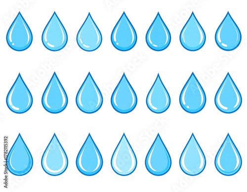 A cartoon-style illustration of numerous water droplets. The droplets are blue with varying internal highlights, arranged in neat horizontal rows