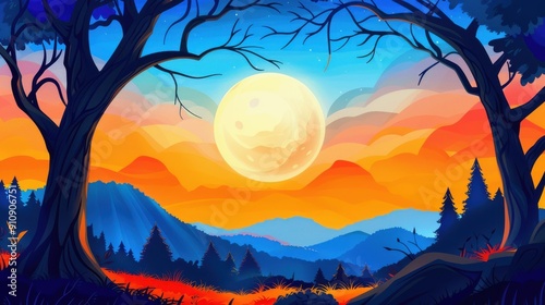 A cartoonstyle painting of a serene forest scene, illuminated by a bright full moon, showcasing vibrant textures.