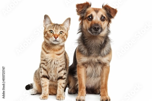 A cat and dog sitting side by side, looking friendly, isolated on a white background.