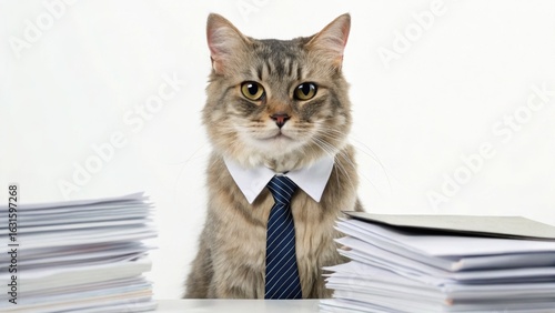 A cat in a suit and tie sits at a desk surrounded by piles of papers, exuding a humorous, business-like demeanor.
